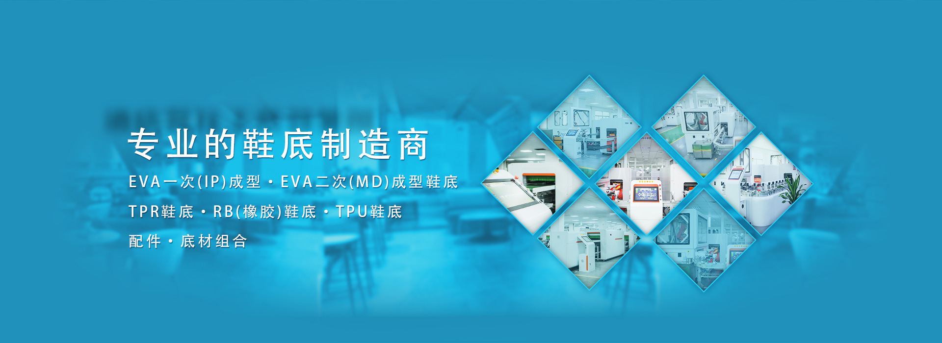 專業生產EVA一次(IP)成型鞋底、EVA二次(MD)成型鞋底、TPR鞋底、RB(橡膠)鞋底,TPU鞋底及配件及底材組合。嚴格的品質監控和ISO9001質量管理體系的有力保障下,根據客戶需要,不斷開發、創新,推出各類新款鞋底。產品除具有國家標準規定的一般物性要求外,還可根據客戶要求,生產具有“柔軟、彈性好、減震、耐磨、防滑、抗靜電、抗高壓”等特性鞋底。